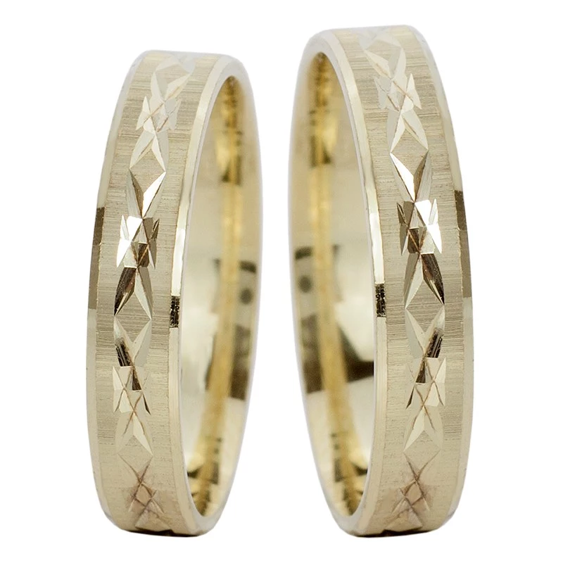 Snubní prsteny ze žlutého zlata se zajímavým zdobením. Snubáky o šíři 4 mm mají porvch jemně matovaný s hezkou rytinou v abstraktním designu. Prsteny se hezky třpytí a dobře se nosí. Varianta pro oba novomanžele je stejná. Sbalit popis