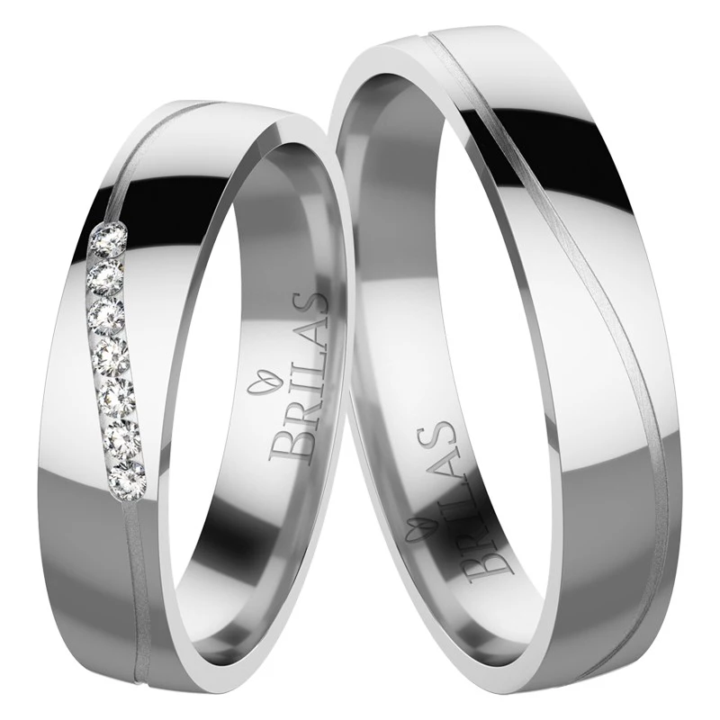 Krásné snubní prsteny z bílého zlata. Povrch prstenů je proveden v lesklé úpravě. Linka, která prsten zdobí je matná. Tento model vyniká svým jednoduchým a nadčasovým designem. Dámský prsten v šikmé linii osazen sedmi kamene průměru 1,25 mm. Vybrat si můžete zirkon, přírodní diamant v kvalitě Si nebo laboratorní diamant, který je laboratorně vytvořený diamant, jehož optické, chemické a fyzikální vlastnosti jsou naprosto totožné s klasickým diamantem. Disponuje tedy stejnou krásou jako vytěžené diamanty. Diamant je kvality VS a barvy E,F. Šíře prstenů je 3,85 mm. Sbalit popis