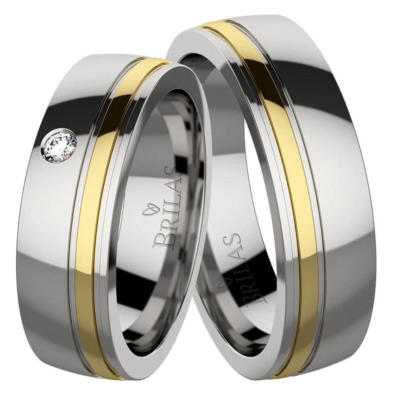 Krásné snubní prstýnky z chirurgické oceli mají šíři 6 mm. Lesklý povrch zdobí jen úzké ryté linie, mezi kterými je zlatý pruh (pozlaceno). Dámský prsten je osazen kulatým zirkonem o průměru 2,3 mm. Prsteny vypadají velice hezky a díky kvalitnímu zpracování jsou od zlatých prstenů téměř k nerozeznání. Doporučujeme. Sbalit popis