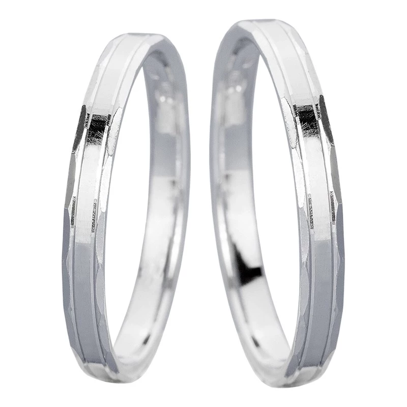 Snubní prsteny vyrobené z bílého zlata. Oba modely jsou stejné, bez kamenů. Prsteny jsou velmi úzké, jejich šířka je 2,5 mm. Na prstenech jsou viditelné dvě ryté linky. Jejich hrany jsou zkosené. U tohoto páru prstenů není možná rytina stylu Montez. Sbalit popis