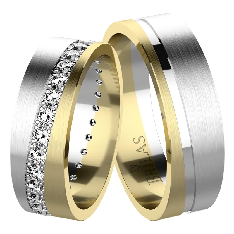 Nádherné snubní prsteny z bílého a žlutého zlata o šířce 6,1 mm. Oba prsteny jsou zdobeny zapuštěným šikmým žlábkem po celém obvodě. UU dámského prstene je žlábek osazen cca 35 kameny o průměru 1,75 mm. Vybrat si můžete zirkon, přírodní diamant v kvalitě Si nebo laboratorní diamant, který je laboratorně vytvořený diamant, jehož optické, chemické a fyzikální vlastnosti jsou naprosto totožné s klasickým diamantem. Disponuje tedy stejnou krásou jako vytěžené diamanty. Diamant je kvality VS a barvy E,F. Žlábek je z lesklého zlata a zbylá část prstene je tvořena žlutým zlatem s povrchovou úpravou zvanou "vodorovný mat". Prsteny mají rovný profil. Sbalit popis