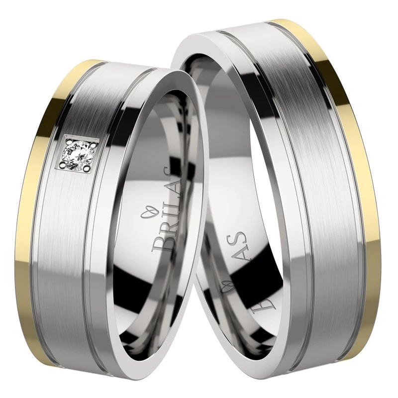 Moderní snubní prsteny z chirurgické oceli zdobené pozlacením. Prsteny o šíři 6 mm mají prostřední pruh matný a krajní linie, oddělené rytou linkou, lesklé. Jedna krajní linie má zlatou barvu. Dámská prsten je navíc osazen vprostřed kulatým zirkonem (průměr 1,5 mm) v hranatém rámečku. Klasický a při tom netradiční design prstenů, příjemné nošení, to vše láká ke koupi těchto snubních prstýnků. Vzhledem i designem se velmi podobají zlatým prstenům. Sbalit popis