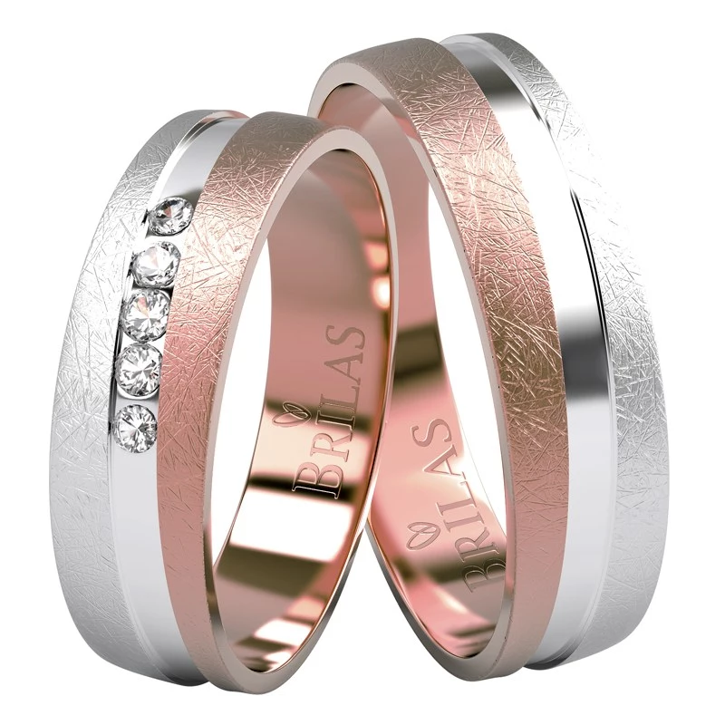Elegantní snubní prstýnky v kombinaci bílého a červeného zlata s moderní a bytelnou úpravou povrchu. Rotační diamantování je u těchto prstenů tím hlavním lákadlem. Prsteny jsou neskutečně elegantní a určené pro všechny, kteří mají rádi originalitu a styl. Šíře 5 mm. Centrální kámen je velikosti 1,75 mm. Ostatní kameny mají 1,5 mm a 1,25 mm. Vybrat si můžete zirkon, přírodní diamant v kvalitě Si nebo laboratorní diamant, který je laboratorně vytvořený diamant, jehož optické, chemické a fyzikální vlastnosti jsou naprosto totožné s klasickým diamantem. Disponuje tedy stejnou krásou jako vytěžené diamanty. Diamant je kvality VS a barvy E,F. Sbalit popis