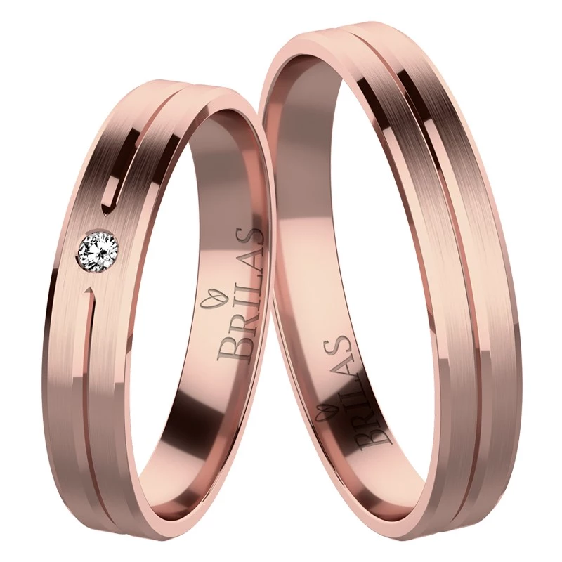 Zajímavé snubní prsteny z červeného zlata. Povrchová úprava je matná, kde prostřední rovná linka a hrany prstene jsou lesklé. Šíře prstenů je příjemných 3,5 mm. V dámské variantě je osazený 1 kámen, s možností výběru zirkonu nejvyšší kvality nebo briliantu kvality VS1/F o velikosti 1,5 mm. Garance nevypadnutí kamene. Sbalit popis