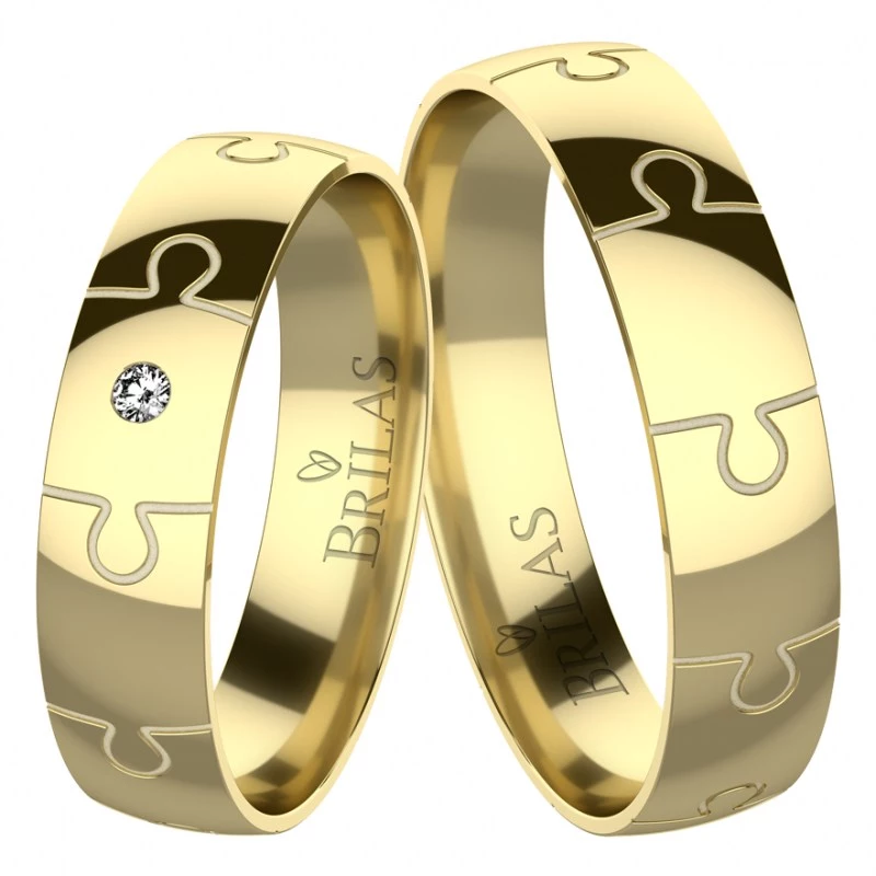 Originální prsteny ze žlutého zlata pro mladé páry, které preferují jedinečnost. Lesklé snubáky široké 4,6 mm každého oslní svým zajímavým rytím ve tvaru puzzle. Dámský model je ve středu zdoben kamenem velikosti 1,5 mm. Vybrat si můžete zirkon, přírodní diamant v kvalitě Si nebo laboratorní diamant, který je laboratorně vytvořený diamant, jehož optické, chemické a fyzikální vlastnosti jsou naprosto totožné s klasickým diamantem. Disponuje tedy stejnou krásou jako vytěžené diamanty. Diamant je kvality VS a barvy E,F. Sbalit popis