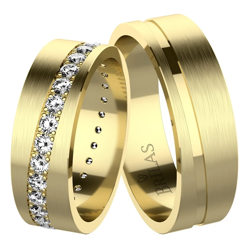 Nádherné snubní prsteny ze žlutého zlata o šířce 6,1 mm. Oba prsteny jsou zdobeny zapuštěným šikmým žlábkem po celém obvodě. U dámského prstene je žlábek osazen cca 35 kameny o průměru 1,75 mm. Vybrat si můžete zirkon, přírodní diamant v kvalitě Si nebo laboratorní diamant, který je laboratorně vytvořený diamant, jehož optické, chemické a fyzikální vlastnosti jsou naprosto totožné s klasickým diamantem. Disponuje tedy stejnou krásou jako vytěžené diamanty. Diamant je kvality VS a barvy E,F. Žlábek je z lesklého zlata a zbylá část prstene je tvořena žlutým zlatem s povrchovou úpravou zvanou "vodorovný mat". Prsteny mají rovný profil. Sbalit popis