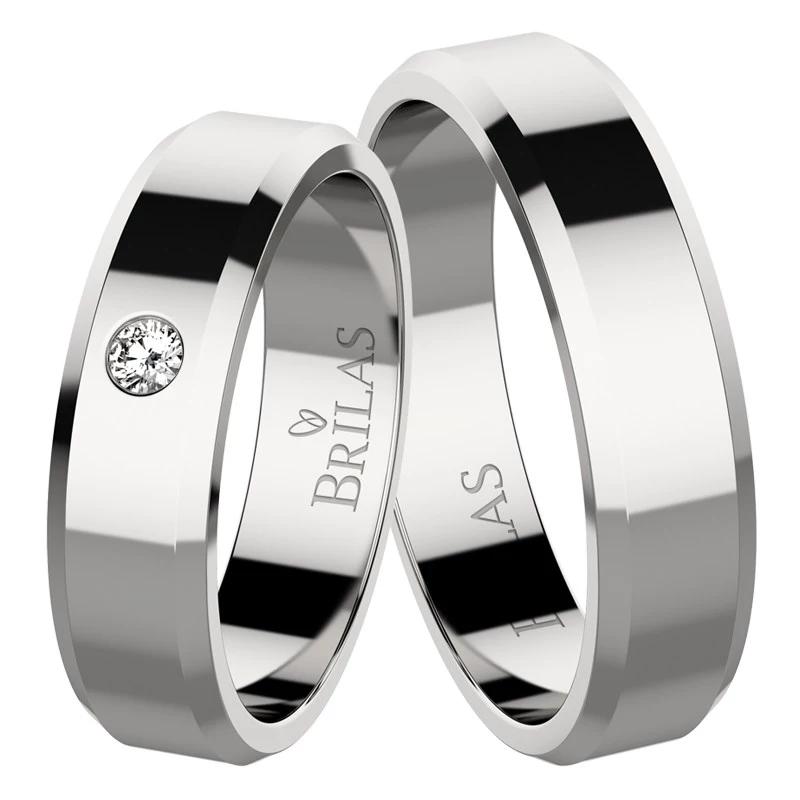Ocelové snubní prsteny mají rovný profil a zároveň zkosené hrany. Jejich povrch je celý lesklý a oba mají šíři 5 mm, proto na ruce jsou nepřehlédnutelné. Jednoduché, svým způsobem i stylové prsteny, které vypadají dobře. Model prodáváme ve stříbře, i ve zlatě v bezkamenové verzi. Dámský prstýnek zdobí jeden kámen o velikosti 1,5 mm. Sbalit popis