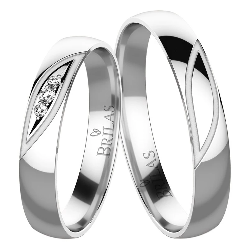 Snubní prsteny z bílého zlata pro páry, které sázejí na jednoduchost. Lesklé prsteny v kombinaci s jemným matováním. Decentní prsteny s šíří 3,6 mm, jsou zdobeny nenápadnou slzičkou. Tuto slzu uprostřed lemují matnou plochu, které je v pánském modelu bez zdobení a v dámském modelu je obohacena třemi kameny. Středový kámen je o rozměru 1,5 mm a postranní o rozměru 1,25 mm. Sbalit popis