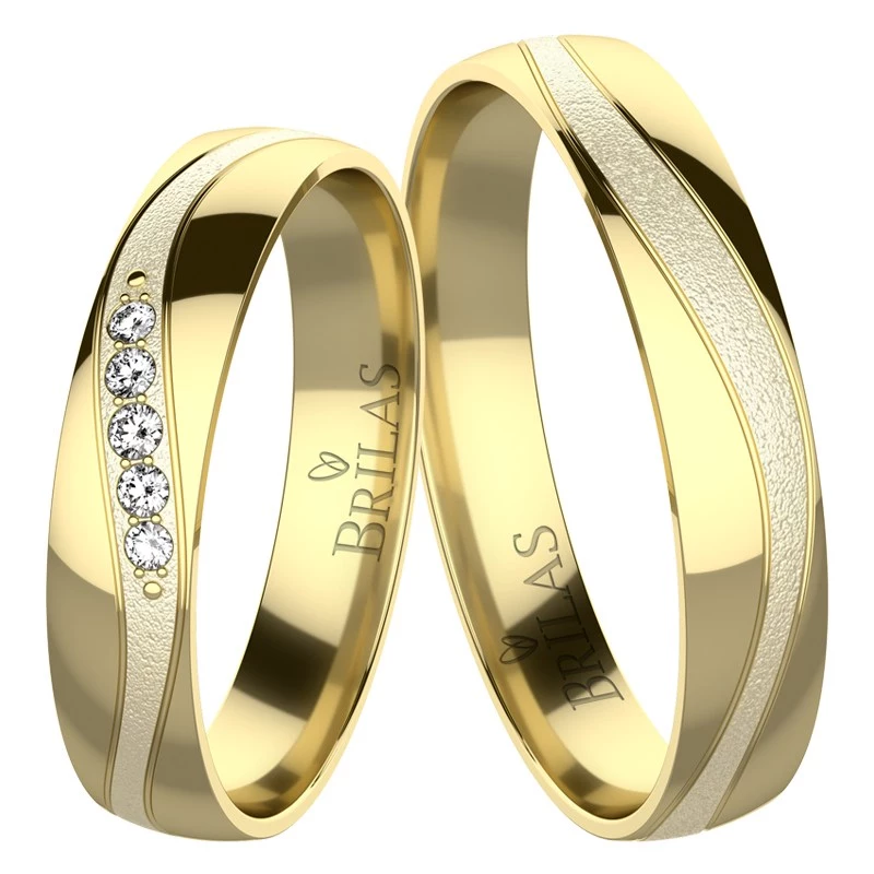 Zlaté snubní prsteny vytvořené ve žluté barvě. Jejich povrchová úprava je střídána pískováním a leskem, kdy uprostřed obrouček je pískovaná větší vlnka. U modelu pro nevěstu jsou v řadě za sebou vsazeny kameny. Slečna si může vybrat mezi zirkonem, briliantem nebo laboratorním briliantem kvality Si nebo VS. Počet kamenů: 5 ks. Model pro ženicha je bez kamenů. Šíře prstenů činí 3,8 mm. Sbalit popis