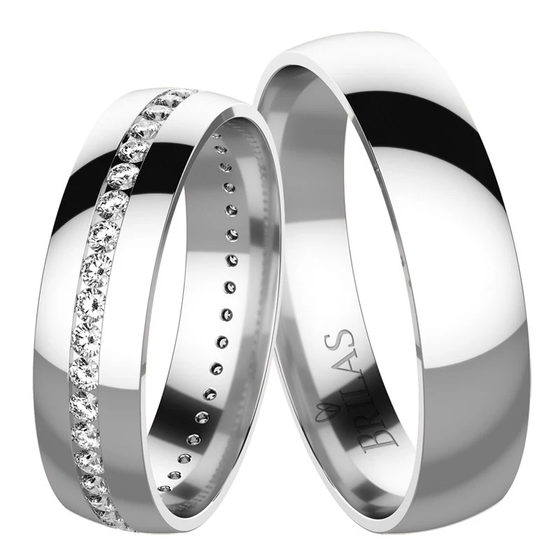 Snubní prsteny jsou vyrobeny z bílého zlata. Jejich šíře je 4,85 mm. Povrchová úprava se skládá z lesku. Pánský prsten je jednoduchý klasický bez zdobení. Dámský je osazen ve středu obroučky kameny po celém obvodu. Vybrat si můžete zirkon, přírodní diamant v kvalitě Si nebo laboratorní diamant, který je laboratorně vytvořený diamant, jehož optické, chemické a fyzikální vlastnosti jsou naprosto totožné s klasickým diamantem. Disponuje tedy stejnou krásou jako vytěžené diamanty. Diamant je kvality VS a barvy E,F. Sbalit popis