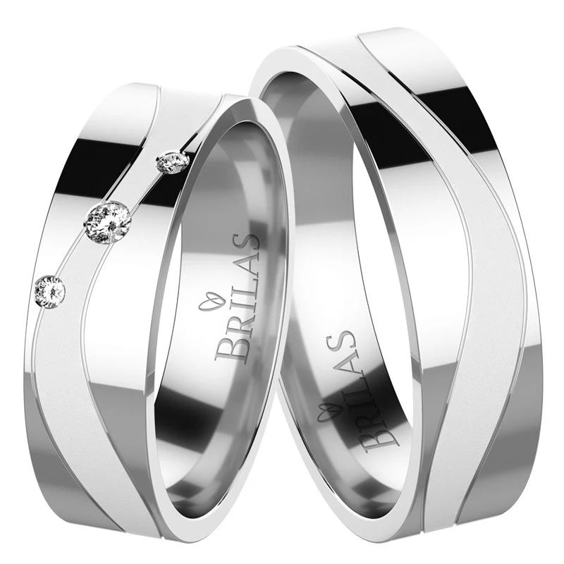 Zlaté snubní prsteny vytvořené v bílé barvě. Jejich povrchová úprava je střídání matu a lesku. U modelu pro nevěstu jsou v řadě za sebou vsazeny 3 kameny. Vybrat si můžete zirkon, přírodní diamant v kvalitě Si nebo laboratorní diamant, který je laboratorně vytvořený diamant, jehož optické, chemické a fyzikální vlastnosti jsou naprosto totožné s klasickým diamantem. Disponuje tedy stejnou krásou jako vytěžené diamanty. Diamant je kvality VS a barvy E,F. Model pro ženicha je bez kamenů. Šíře prstenů činí 5,3 mm. Sbalit popis