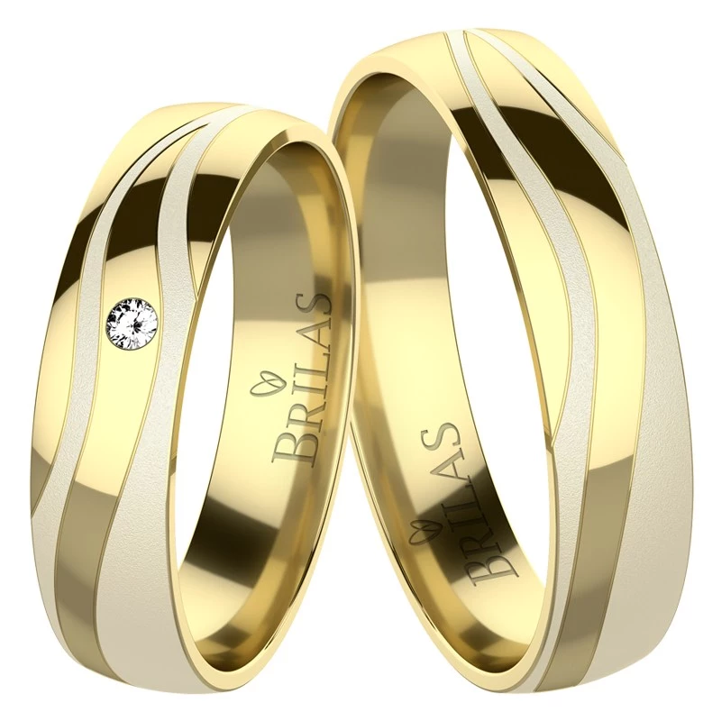 Zajímavé zlaté snubní prsteny vytvořené ve žluté barvě. Jejich povrchová úprava je střídána matem a leskem, kdy se střídají lesklé a matné vlnky. U modelu pro nevěstu je na prstenu vložen jeden kamínek. Slečna si může vybrat mezi zirkonem nebo briliantem kvality Si. Model pro ženicha je bez kamenů. Šíře prstenů činí 4,6 mm. Sbalit popis
