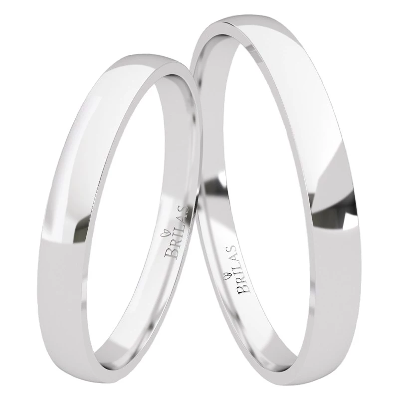 Drobné snubní prstýnky z bílého zlata. Snubní prsteny o šíři 2,5 mm mají lesklý povrch, design je bez zdobení. Varianta pro muže i ženu je stejná, bez kamenů. Tyto prstýnky jsou určeny všem, kteří chtějí jednoduché prstýnky za příjemnou cenu. U tohoto páru prstenů není možná rytina stylu Montez. Sbalit popis