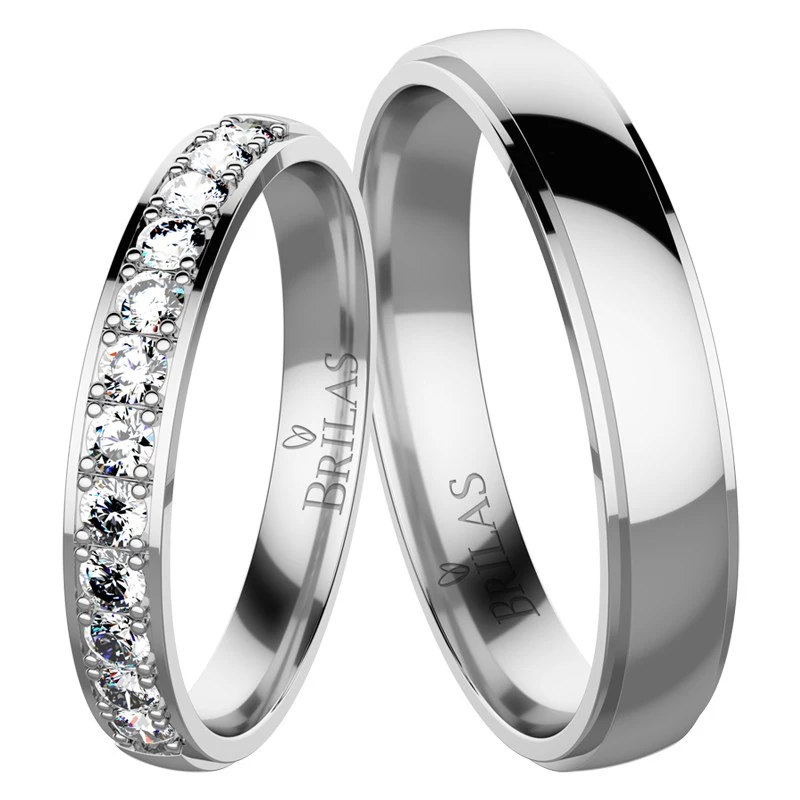 Jemné snubní prstýnky z bílého zlata. Dámská varianta je osazena zirkony nejvyšší kvality, laboratorními brilianty VS E/F či brilianty kvality SI1/G o velikosti 2 mm. Pánský prsten má šíři 4 mm. Prsteny jsou v lesklé povrchové úpravě. Tyto prsteny jsou vhodné pro páry preferující lehkou eleganci. Sbalit popis