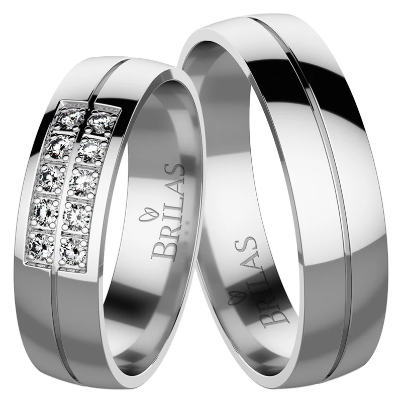 Snubní prsteny z bílého zlata o šíři 5 mm. Oba prsteny jsou rozděleny na dvě části linkou. Prsteny jsou v lesklé povrchové úpravě. Dámský prsten je osazen deseti kameny, ve dvou řadách, o průměru 1,5 mm. Vybrat si můžete zirkon, přírodní diamant v kvalitě Si nebo laboratorní diamant, který je laboratorně vytvořený diamant, jehož optické, chemické a fyzikální vlastnosti jsou naprosto totožné s klasickým diamantem. Disponuje tedy stejnou krásou jako vytěžené diamanty. Diamant je kvality VS a barvy E,F. Sbalit popis