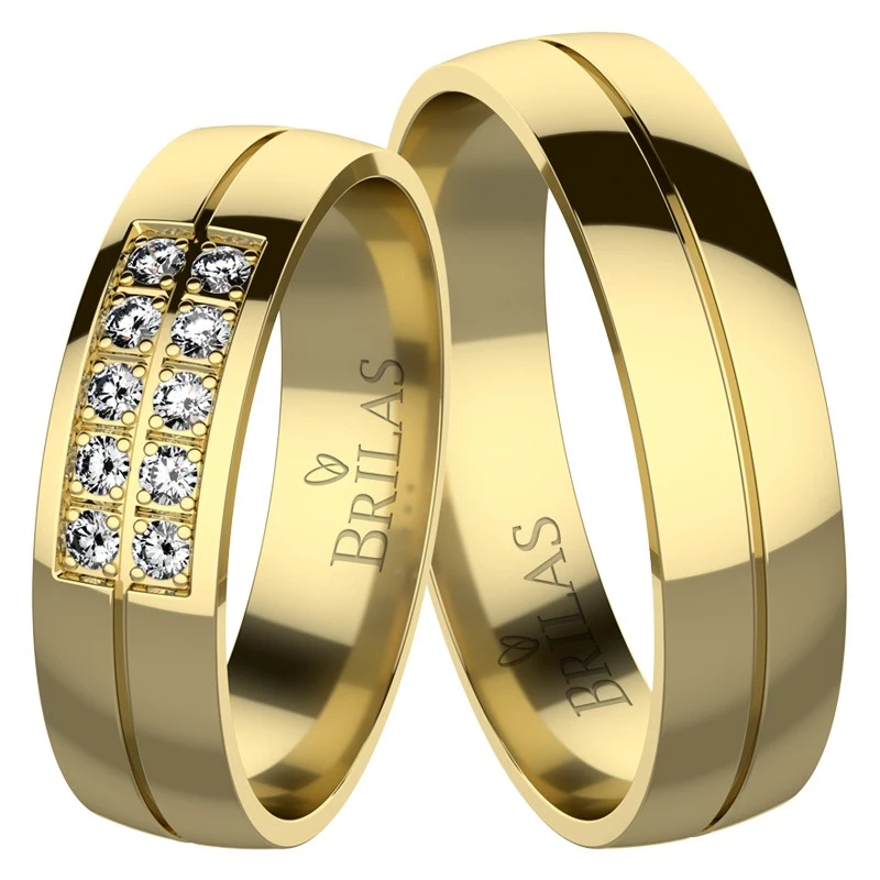 Snubní prsteny ze žlutého zlata o šíři 5 mm. Oba prsteny jsou rozděleny na dvě části linkou. Prsteny jsou v lesklé povrchové úpravě. Dámský prsten je osazen deseti kameny, ve dvou řadách, o průměru 1,5 mm. Vybrat si můžete zirkon, přírodní diamant v kvalitě Si nebo laboratorní diamant, který je laboratorně vytvořený diamant, jehož optické, chemické a fyzikální vlastnosti jsou naprosto totožné s klasickým diamantem. Disponuje tedy stejnou krásou jako vytěžené diamanty. Diamant je kvality VS a barvy E,F. Sbalit popis
