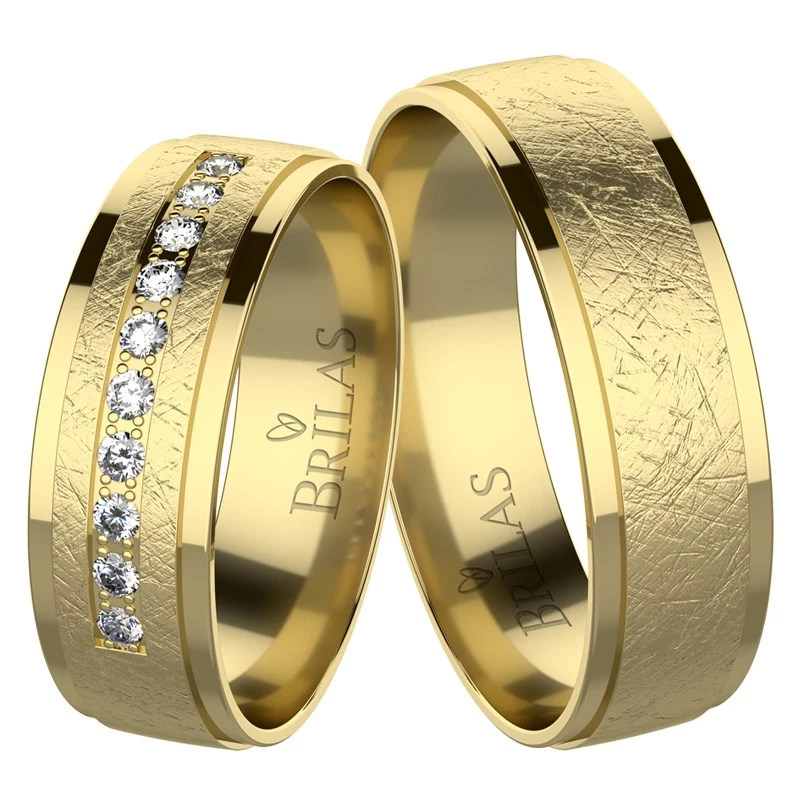 Krásné snubní prsteny v kombinaci lesku a diamantování vyrobené ze žlutého zlata. Prsteny mají velkorysou šíři 6 mm. Uprostřed dámského prsten se táhne linie kamenů o počtu 10 ks a velikosti 1,5 mm (briliant, zirkon). U tohoto vzoru můžete libovolně měnit barvu zlata, včetně povrchové úpravy. Doporučujeme pro všechny páry, kde má muž masivní prsty. Sbalit popis