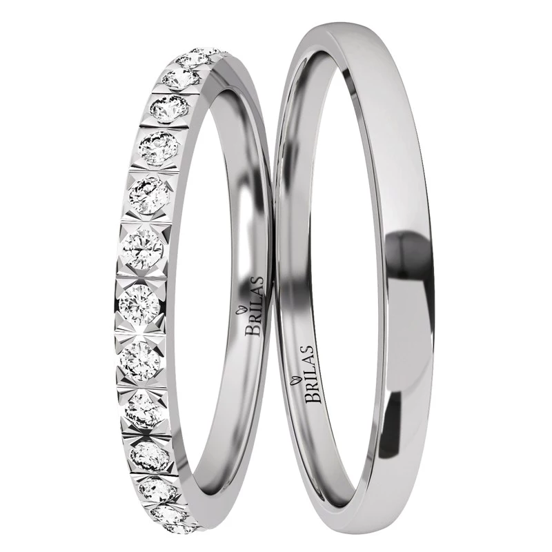 Jedinečný skvost mezi více kamenovými prsteny, to jsou prsteny Tamara. Elegantní a velmi jemné kousky z bílého zlata a šíře 2 mm budou dokonalými prsteny pro Váš velký den. Pánský prsten je jednoduchým hladkým kroužkem, který působí na ruce velmi příjemně. Dámský je poté ozvláštněn 28‑mi kameny, díky kterým Vám tyto prsteny vezmou dech. Tyto neodolatelné a překrásné prsteny je možné vyrobit i s brilianty čistoty IF, tedy brilianty, které jsou dokonale a bezchybně čisté. Tyto kameny jsou velmi vzácné a jsou řazeny mezi investiční brilianty. Rovněž mají kameny další jedinečnost a tou je jejich barva D, tedy barva symbolizující tu nejvyšší kvalitu. Tak co myslíte, "investujete" do těchto nádherných prstenů s námi a necháte se jimi provázet celý Váš společný život? Sbalit popis