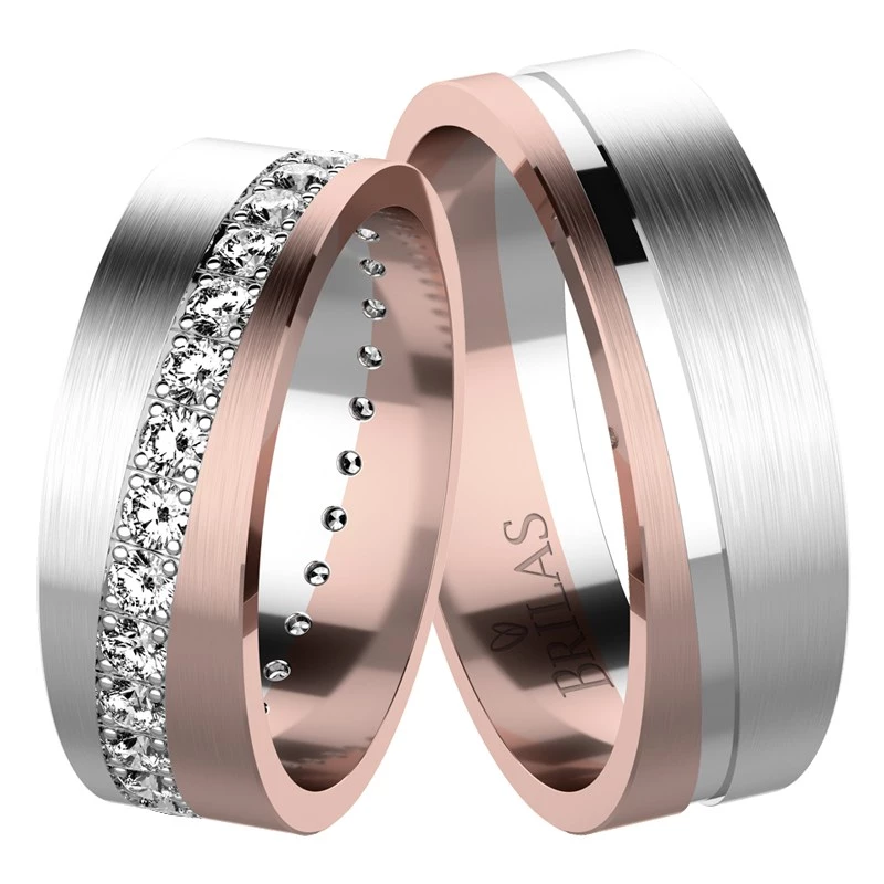 Nádherné snubní prsteny z bílého zlata a červeného o šířce 6,1 mm. Oba prsteny jsou zdobeny zapuštěným šikmým žlábkem po celém obvodě. U dámského prstene je žlábek osazen cca 35 kameny o průměru 1,75 mm. Vybrat si můžete zirkon, přírodní diamant v kvalitě Si nebo laboratorní diamant, který je laboratorně vytvořený diamant, jehož optické, chemické a fyzikální vlastnosti jsou naprosto totožné s klasickým diamantem. Disponuje tedy stejnou krásou jako vytěžené diamanty. Diamant je kvality VS a barvy E,F. Žlábek je z lesklého zlata a zbylá část prstene je tvořena červeným zlatem s povrchovou úpravou zvanou "vodorovný mat". Prsteny mají rovný profil. Sbalit popis