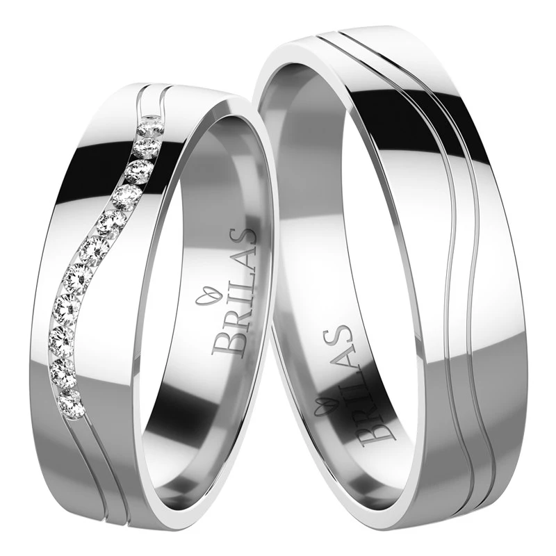 Hezké snubní prsteny z lesklého bílého zlata, jež jsou zdobeny vyrytým žlábkem. Dámský prsten je ve žlábku zdoben celkem 11ti zirkony nebo brilianty o průměru 1,5 mm. Šíře prstenů činí 4,5 mm. Sbalit popis