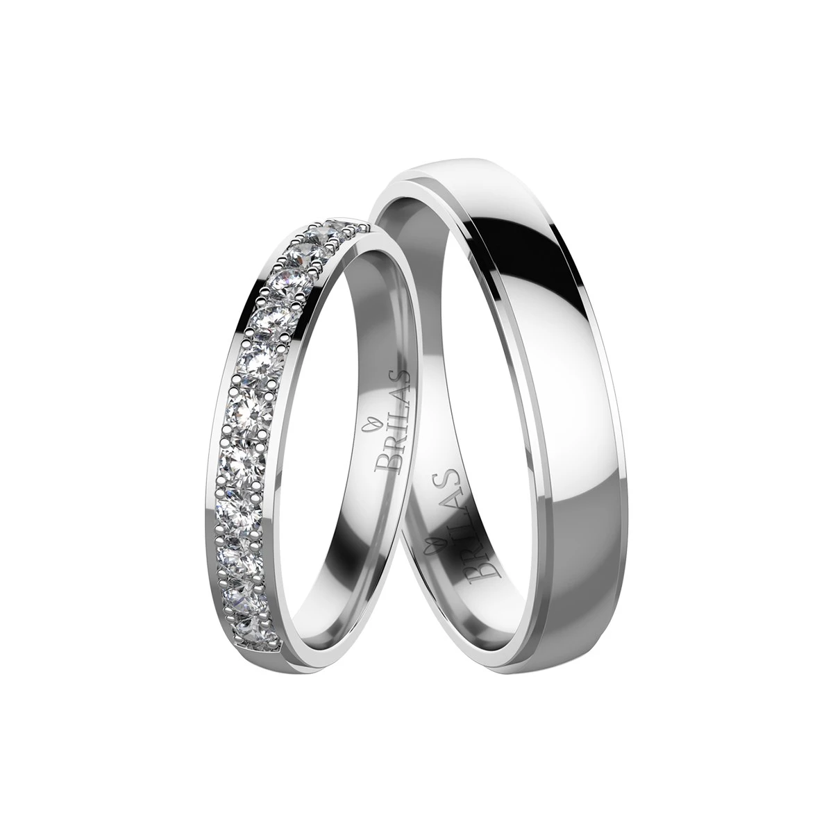 Jemné snubní prstýnky ze stříbra. Dámská varianta je osazena 12ti zirkony o velikosti 1,4 mm a má šíři 3,4 mm. Pánský prsten má šíři 4 mm. Prsteny jsou v lesklé povrchové úpravě. Sbalit popis