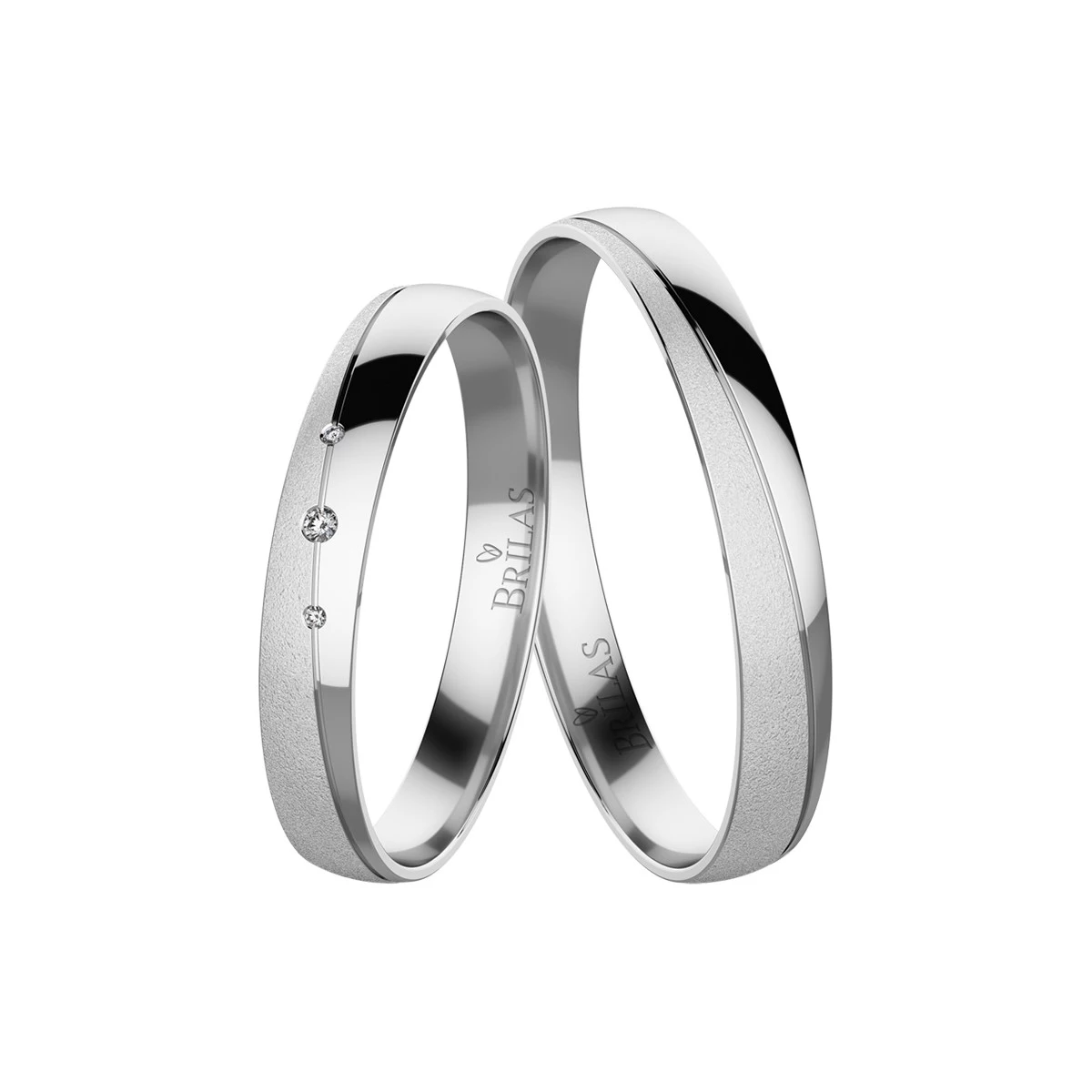 Exkluzivní snubní prsteny z bílého zlata. Prsteny mají krásnou kombinaci lesku a pískování, kterou rozděluje decentní vlnka. Šíře je 3 mm. Na dámském prstenu jsou celkem 3 kameny, které si můžete zvolit ve variantě zirkonů, briliantů nebo laboratorních briliantů. Centrální kámen má rozměr 1,25 a postranní kamínky mají velikost 1 mm. V případě briliantů mají kameny 0,019 ct. Sbalit popis