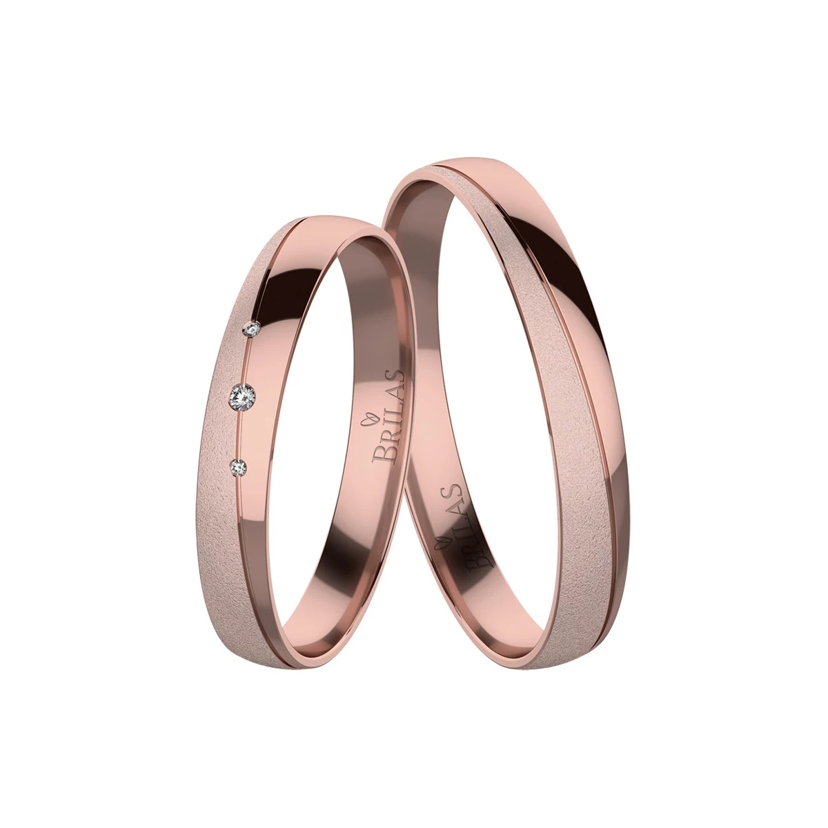 Exkluzivní snubní prsteny z červeného zlata. Prsteny mají krásnou kombinaci lesku a pískování, kterou rozděluje decentní vlnka. Šíře je 3 mm. Na dámském prstenu jsou celkem 3 kameny, které si můžete zvolit ve variantě zirkonů, briliantů nebo laboratorních briliantů. Centrální kámen má rozměr 1,25 a postranní kamínky mají velikost 1 mm. V případě briliantů mají kameny 0,019 ct. Sbalit popis
