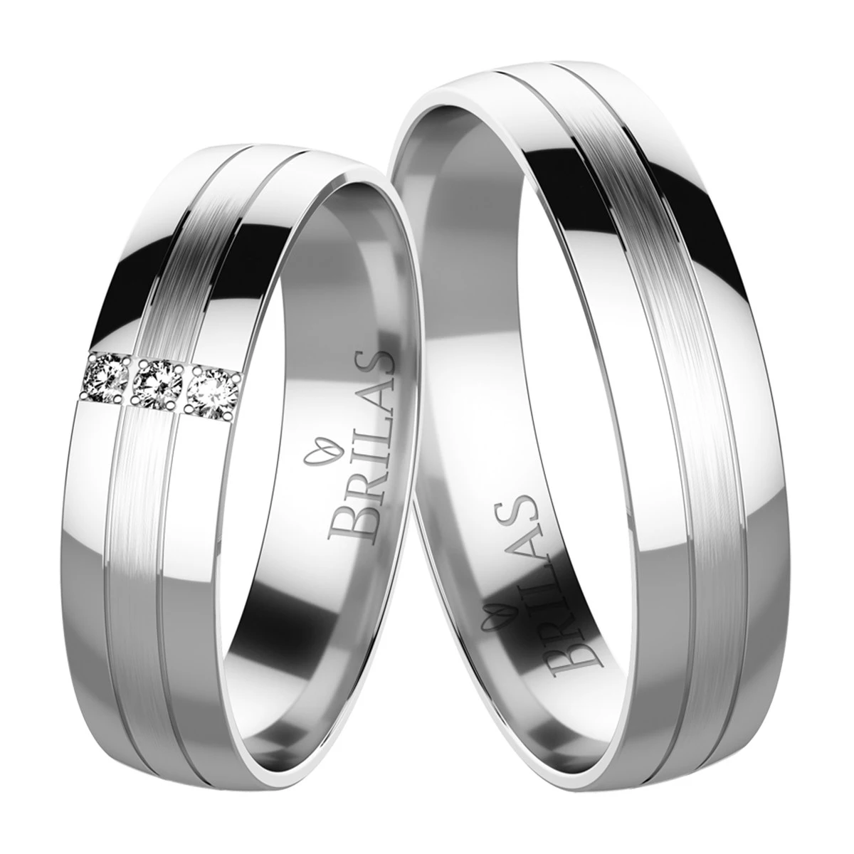 Hezké snubní prsteny v kombinaci matu i lesku jsou tvořeny ze stříbra. Středová linie prstenu je matná a okraje jsou v lesku. Dámský prsten je osazen třemi zirkony. Šíře prstenů je 4,6 mm. Sbalit popis