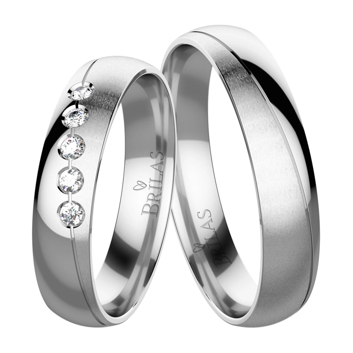 Snubní prsteny ze stříbra v kombinaci lesku a matu. Na prstenech se střídá hladký proužek a matovaný proužek. Dámský model je osazen pěti zirkony. Pánský model je bez kamene se stejným designem jako dámský prsten. Sbalit popis