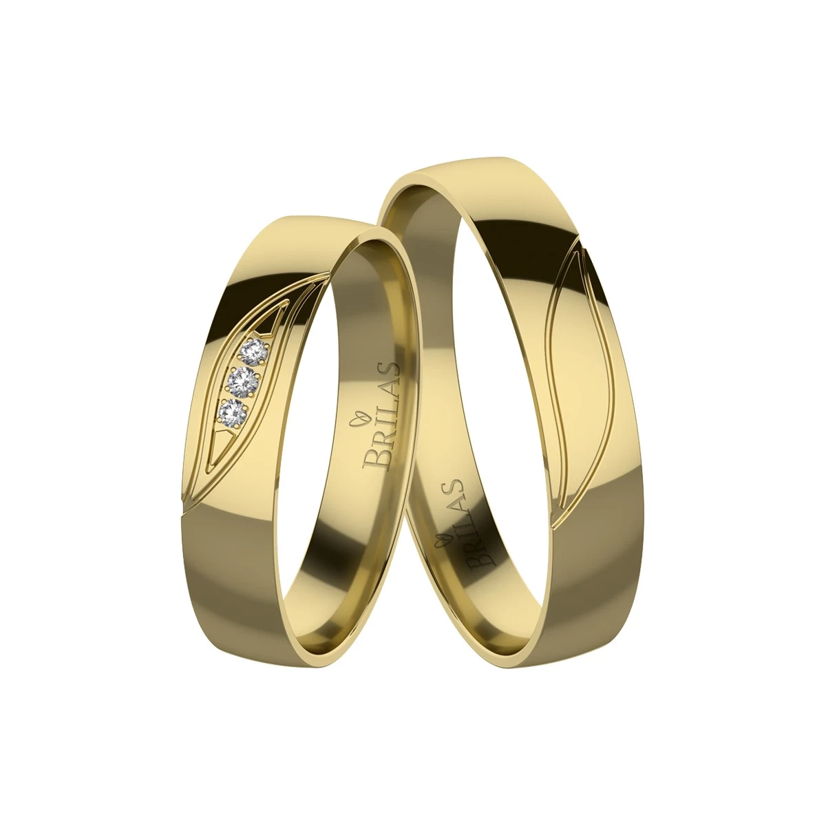 Snubní prsteny ze žlutého zlata pro páry, které sázejí na jednoduchost. Lesklé prsteny v kombinaci s jemným matováním. Decentní prsteny s šíří 4 mm, jsou zdobeny nenápadnou slzičkou. Tuto slzu uprostřed lemuje matná plocha, která je v pánském modelu bez zdobení a v dámském modelu je obohacena třemi kameny. Středový kámen je o rozměru 1,25 mm a postranní o rozměru 1 mm. Volba je poté mezi zirkony, brilianty nebo laboratorními brilianty (0,019 ct.) Sbalit popis