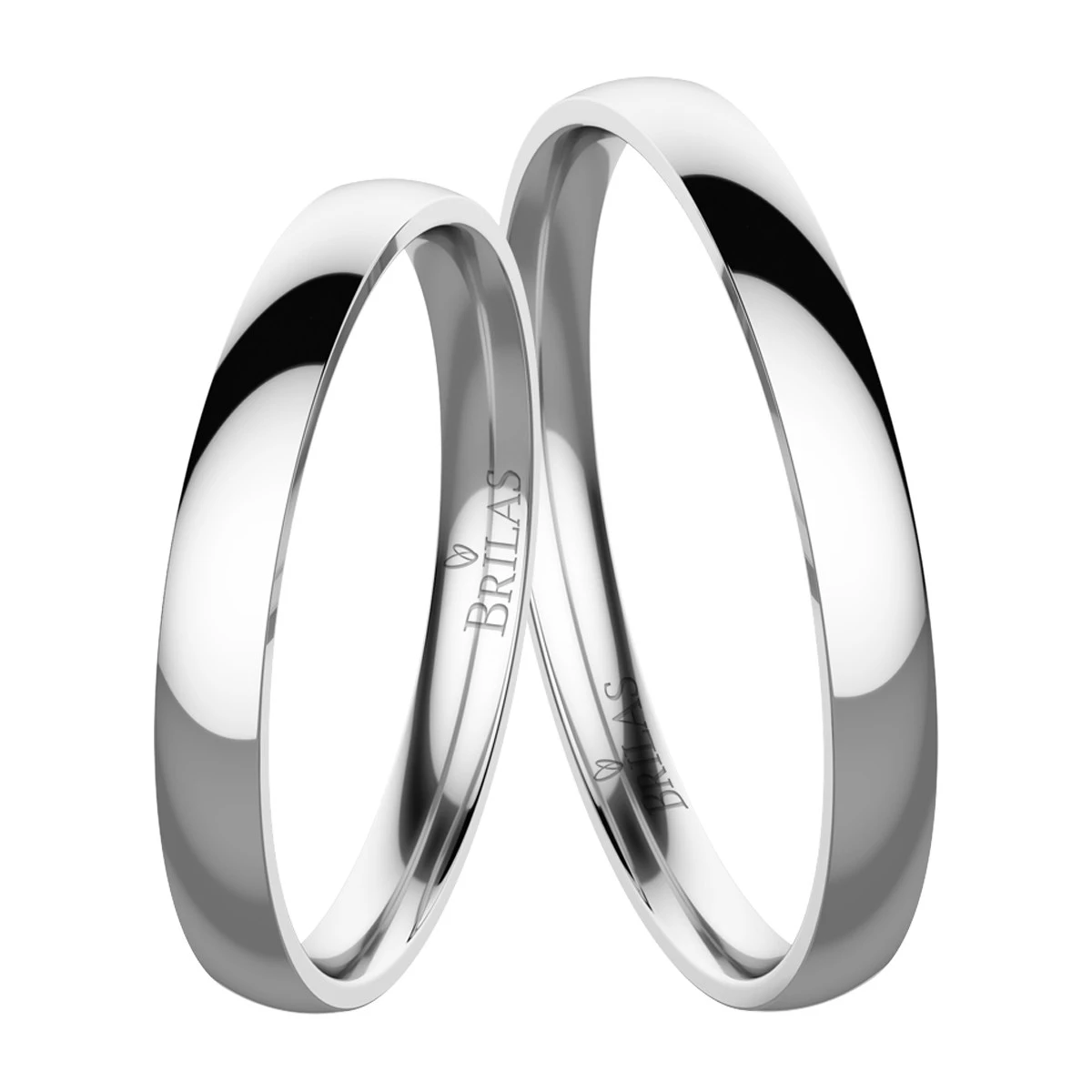 Jednoduché klasické snubní prsteny vyrobené z bílého zlata. Jejich povrch je celý lesklý bez zdobení. Dámský model je shodný jako pánský, bez kamenů. Šíře je 2,5 mm a model je navržen tak, aby byl při nošení co nejpohodlnější. U tohoto páru prstenů není možná rytina stylu Montez. Sbalit popis