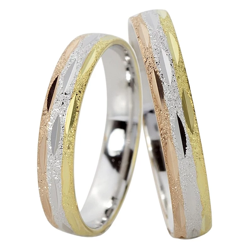 Hezké a elegantní prsteny o šíři 3,8 mm se skládají ze tří pruhů, a to ze žlutého, bílého a červeného zlata. Povrch prstenů je matovaný a velmi pěkně působí rytí ve tvaru elipsy. Varianta snubního prstenu pro muže i ženu je stejná. Chcete‑li vícebarevné zlaté prsteny s matovaným povrchem, určitě se vám budou líbit. Sbalit popis