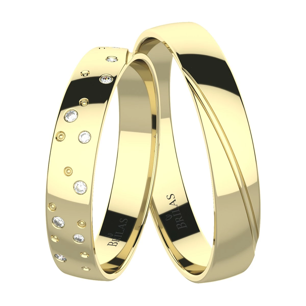 Prsteny ze žlutého zlata, jejichž povrchová úprava je v lesku. Dámský prsten je osazen celkem devíti kameny ve velikostech 1,25 mm a 1,1 mm, u nichž má dáma na výběr mezi zirkony, brilianty laboratorního původu či brilianty (0,069 ct.). Jemné vrypy dodají prstenu pocit většího lesku. Pánský kousek má čistý vzhled a je ozdoben jemnou linkou. Šíře prstenů je 4 mm. Sbalit popis