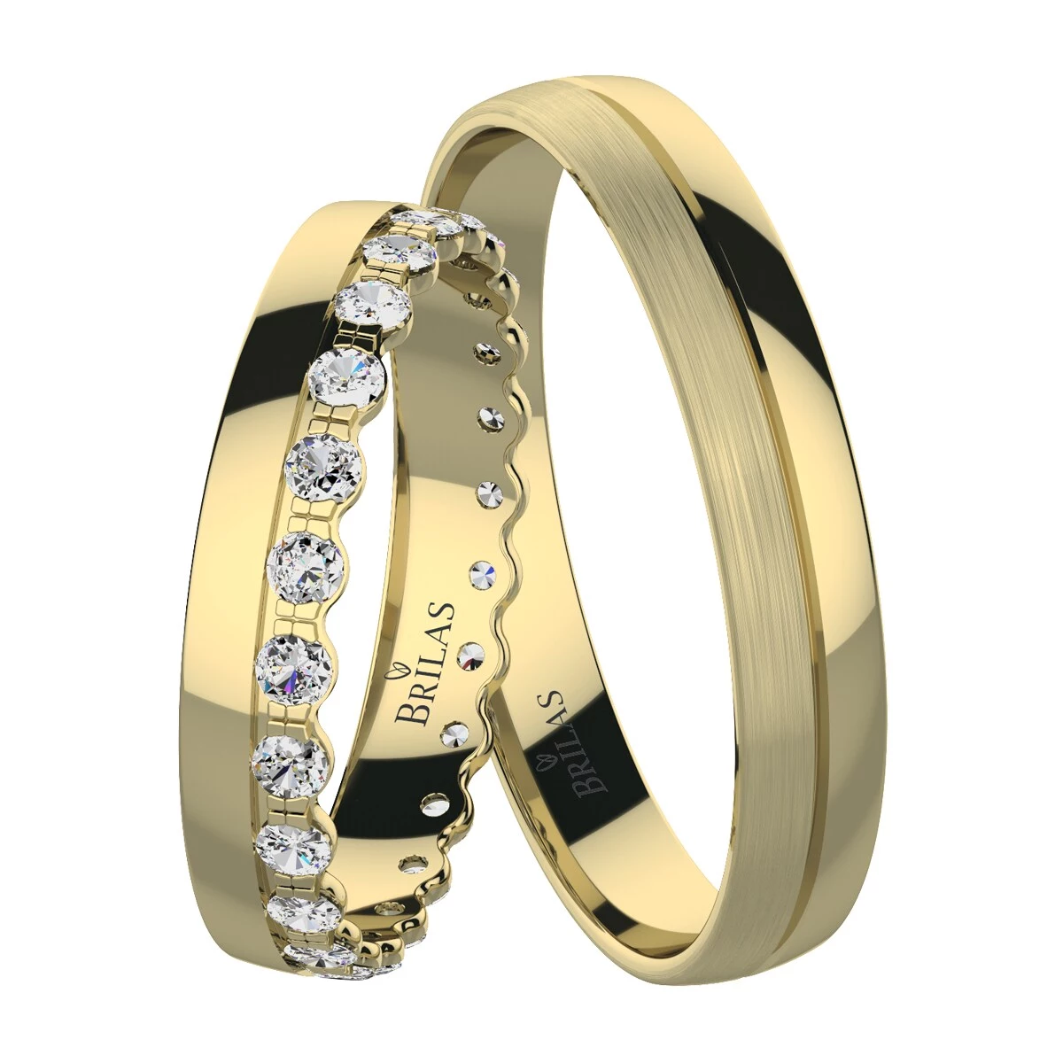 Krásné prsteny Fiera se vyznačují odlišností dámského prstene. Ten má zdobný povrch, nepravidelný tvar a je osazen cca 25ti zirkony, brilianty laboratorního původu či brilianty o velikosti 1,75 mm (0,575 ct.). Jeho jemný vzhled připomíná korunku. Pánský prsten je ve formě hladké obroučky, rozdělené linkou, kde polovina povrchu je lesklá a druhá polovina matná. Sbalit popis