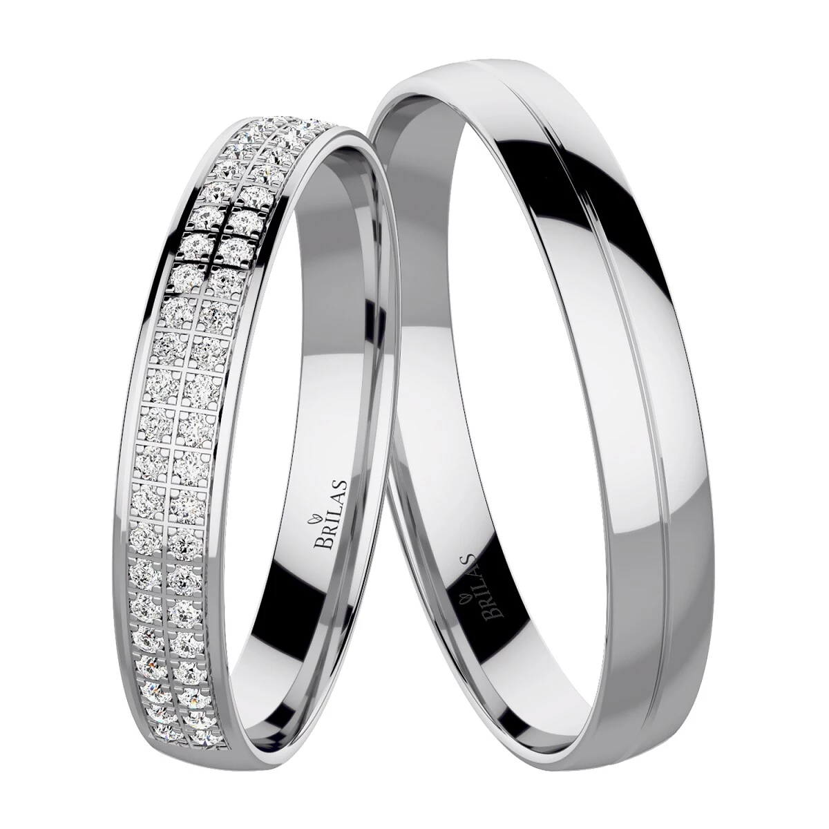 Snubáčky z bílého zlata, které jsou široké 3 mm. Dámský model září cca 52 zirkony, brilianty či laboratorní brilianty o velikosti 1 mm. V případě briliantů kameny váží 0,26 ct. Pánský prsten je bez kamenů zdoben linkou uprostřed. Oba prsteny jsou vyrobeny v lesklé povrchové úpravě. Sbalit popis
