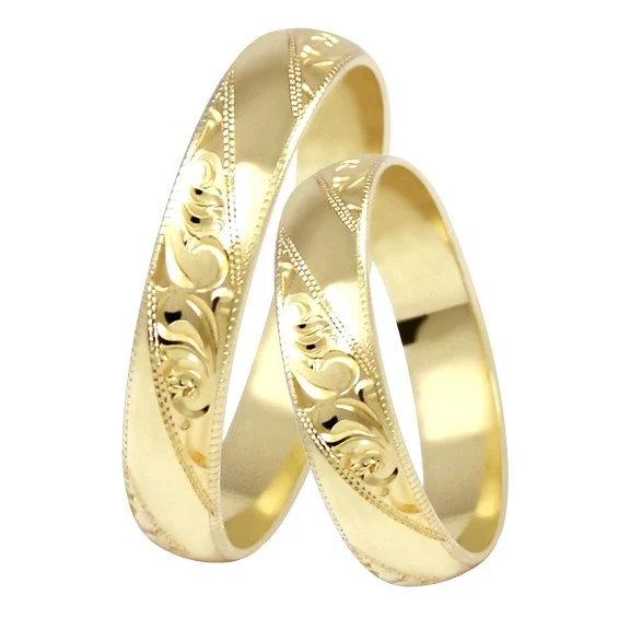 Luxusní snubní prsteny ze žlutého zlata zdobené ručním rytím. Tyto snubní prsteny jsou široké 4 mm. Prsteny jsou v šikmém směru zdobeny abstraktním rytím, které působí dojmem krajky. Sbalit popis