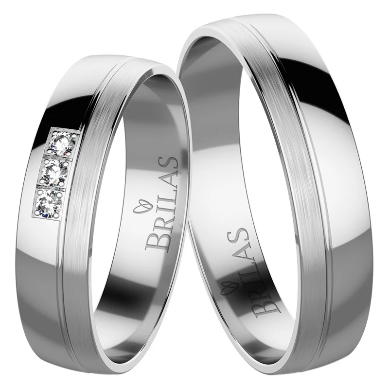 Snubní prsteny z bílého zlata. Užší část prstene má matnou povrchovou úpravu a širší část je lesklá. Aby byl kontrast dokonalý, tak tyto povrchové úpravy rozděluje lesklá vyrytá linka. Dámský prsten je navíc zdoben třemi kameny o průměru 1,5 mm. Vybrat si můžete zirkon, přírodní diamant v kvalitě Si nebo laboratorní diamant, který je laboratorně vytvořený diamant, jehož optické, chemické a fyzikální vlastnosti jsou naprosto totožné s klasickým diamantem. Disponuje tedy stejnou krásou jako vytěžené diamanty. Diamant je kvality VS a barvy E,F. Prsteny mají šířku 5 mm a na ruce vypadají naprosto skvěle. Sbalit popis