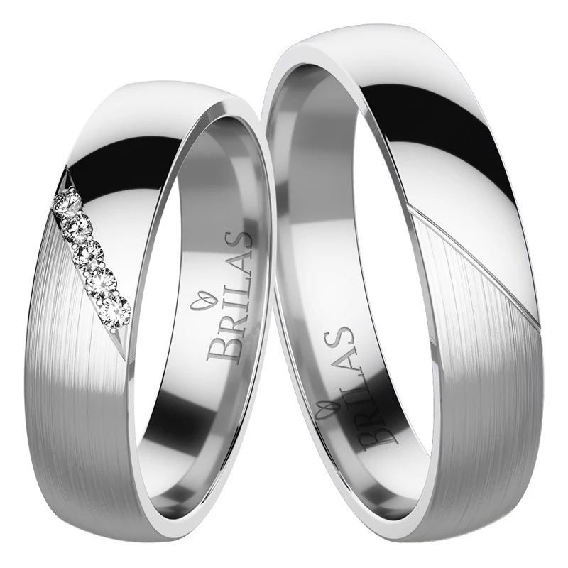 Snubní prsteny z bílého zlata, které jsou pomyslně rozděleny na dvě části. Dámský prsten je osazen 5 kameny v dokonalé linii. Kameny mají rozměr 1,25 mm. Vybrat si můžete zirkon, přírodní diamant v kvalitě Si nebo laboratorní diamant, který je laboratorně vytvořený diamant, jehož optické, chemické a fyzikální vlastnosti jsou naprosto totožné s klasickým diamantem. Disponuje tedy stejnou krásou jako vytěžené diamanty. Diamant je kvality VS a barvy E,F. Šíře prstenů je impozantních 5,5 mm. Prsteny umíme vyrobit v jakékoliv barvě zlata a v jakékoliv povrchové úpravě. Sbalit popis