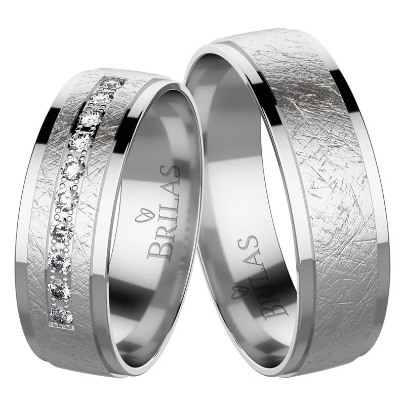 Krásné snubní prsteny v kombinaci lesku a diamantování vyrobené z bílého zlata. Prsteny mají velkorysou šíři 6 mm. Uprostřed dámského prsten se táhne linie kamenů o počtu 10 ks a velikosti 1,5 mm (briliant, zirkon). U tohoto vzoru můžete libovolně měnit barvu zlata, včetně povrchové úpravy. Doporučujeme pro všechny páry, kde má muž masivní prsty. Sbalit popis