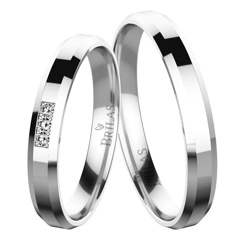 Krásné snubní prstýnky z bílého zlata v lesklé povrchové úpravě. Tento model má zkosené okrajové hrany. Dámská varianta je osazena třemi zirkony nejvyšší kvality nebo brilianty kvality VS1/F kulatého tvaru o velikosti 1,25 mm. Šíře prstenů je 3 mm. Garance nevypadnutí kamene. Sbalit popis