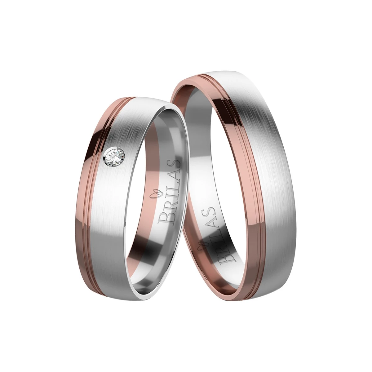 Luxusní snubní prsteny z kombinovaného zlata o šíři 5 mm. Prstýnky jsou tvořeny kombinací červeného a bílého zlata. Užší část prstene je z lesklého červeného zlata s vyrytými linkami po celém obvodě. Širší část je z bílého zlata s vodorovným matováním. Dámský prsten je navíc zdoben kamenem o velikosti 1,5 mm. Vybrat si můžete zirkon, přírodní diamant v kvalitě Si nebo laboratorní diamant, který je laboratorně vytvořený diamant, jehož optické, chemické a fyzikální vlastnosti jsou naprosto totožné s klasickým diamantem. Disponuje tedy stejnou krásou jako vytěžené diamanty. Diamant je kvality VS a barvy E,F. Sbalit popis