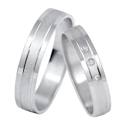 Nádherné snubní prsteny z bílého zlata v kombinaci matu a lesku. Okrajové pruhy jsou vyrobeny v lesklém provedení, středový pruh je zdoben pískováním. Středový pruh je osazen třemi zirkony nebo brilianty. Pánský model je ve stejném designu jako dámský, pouze bez kamenů. Šíře prstenů je 4 mm Sbalit popis