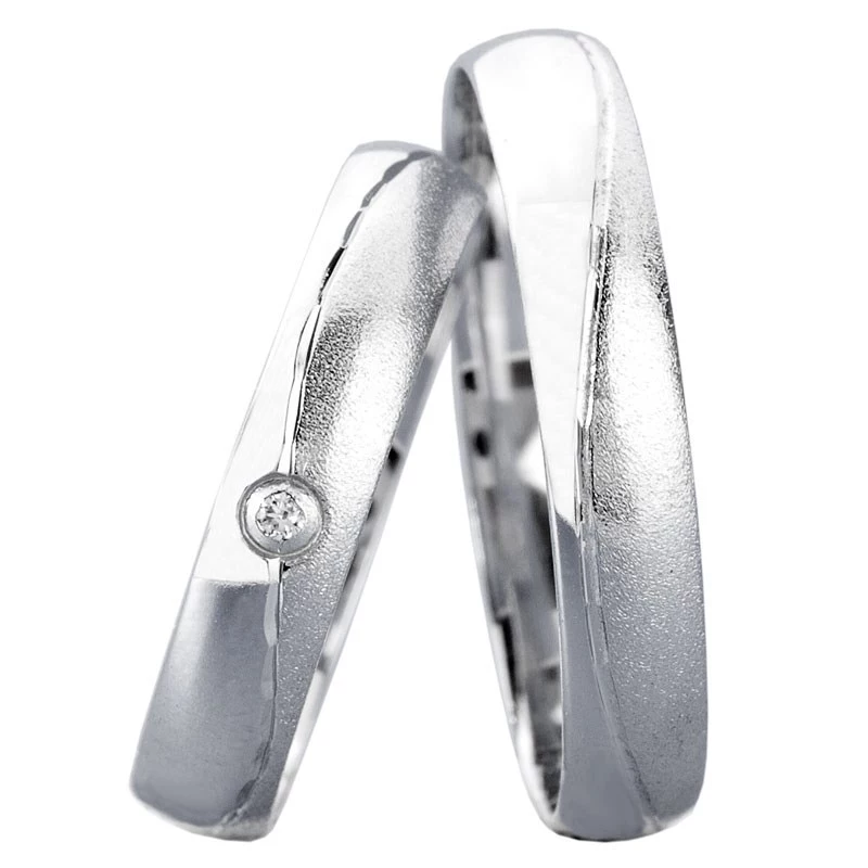 Krásné snubní prsteny z bílého zlata v kombinaci matu a lesku. Tento model je vlnitou rytou linií rozdělen na matnou a lesklou část. Dámský prsten je ve středu osazen zirkonem nebo briliantem průměru 1,5 mm. Pánský model je stejný jako dámský, pouze bez kamenu. Šíře prstenů je 4 mm. Sbalit popis