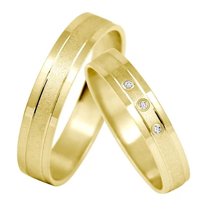 Nádherné snubní prsteny ze žlutého zlata v kombinaci pískování a lesku. Okrajové pruhy jsou vyrobeny v lesklém provedení, středový pruh je zdoben pískováním. Středový pruh je osazen třemi zirkony nebo brilianty. Pánský model je ve stejném designu jako dámský, pouze bez kamenů. Šíře prstenů je 4 mm. Sbalit popis