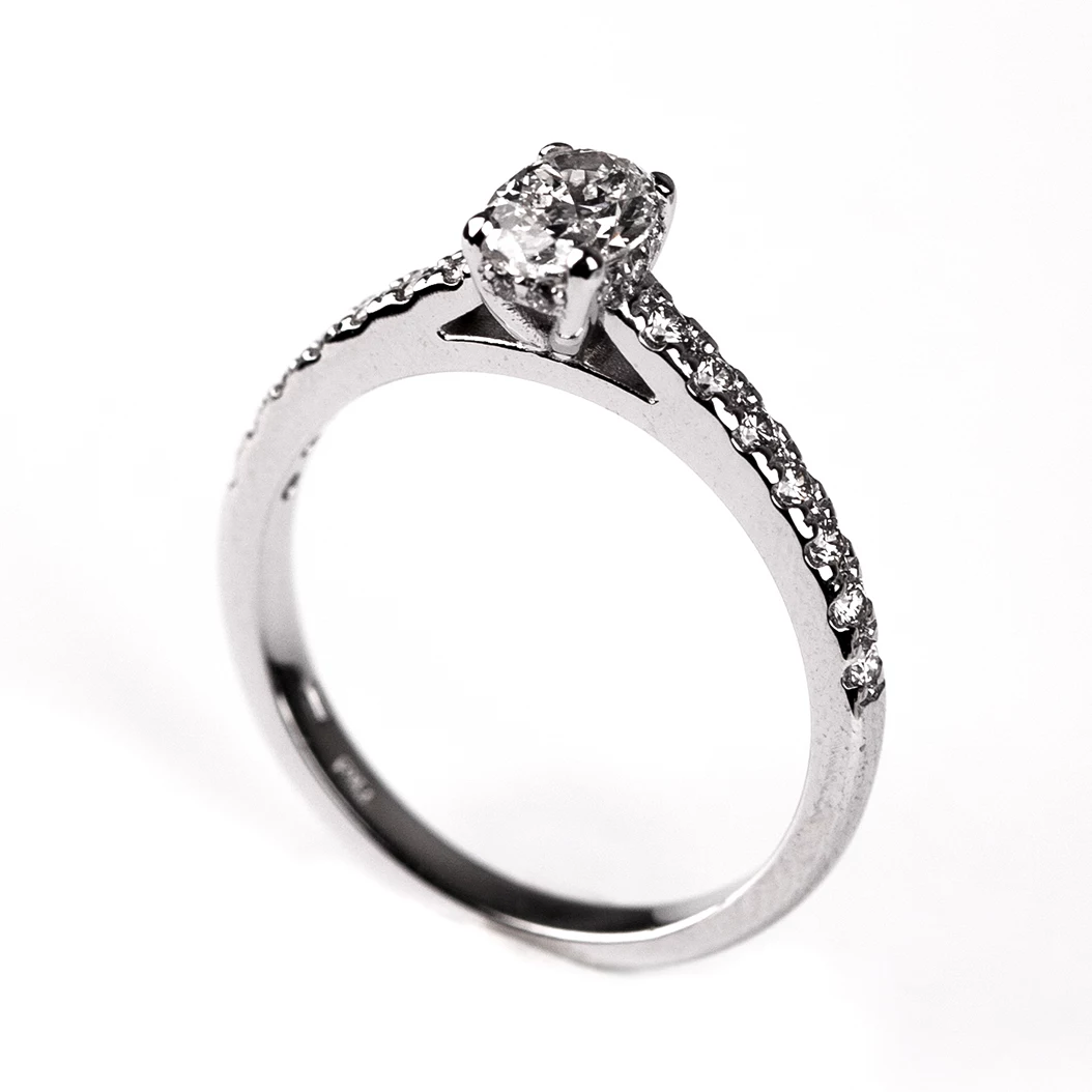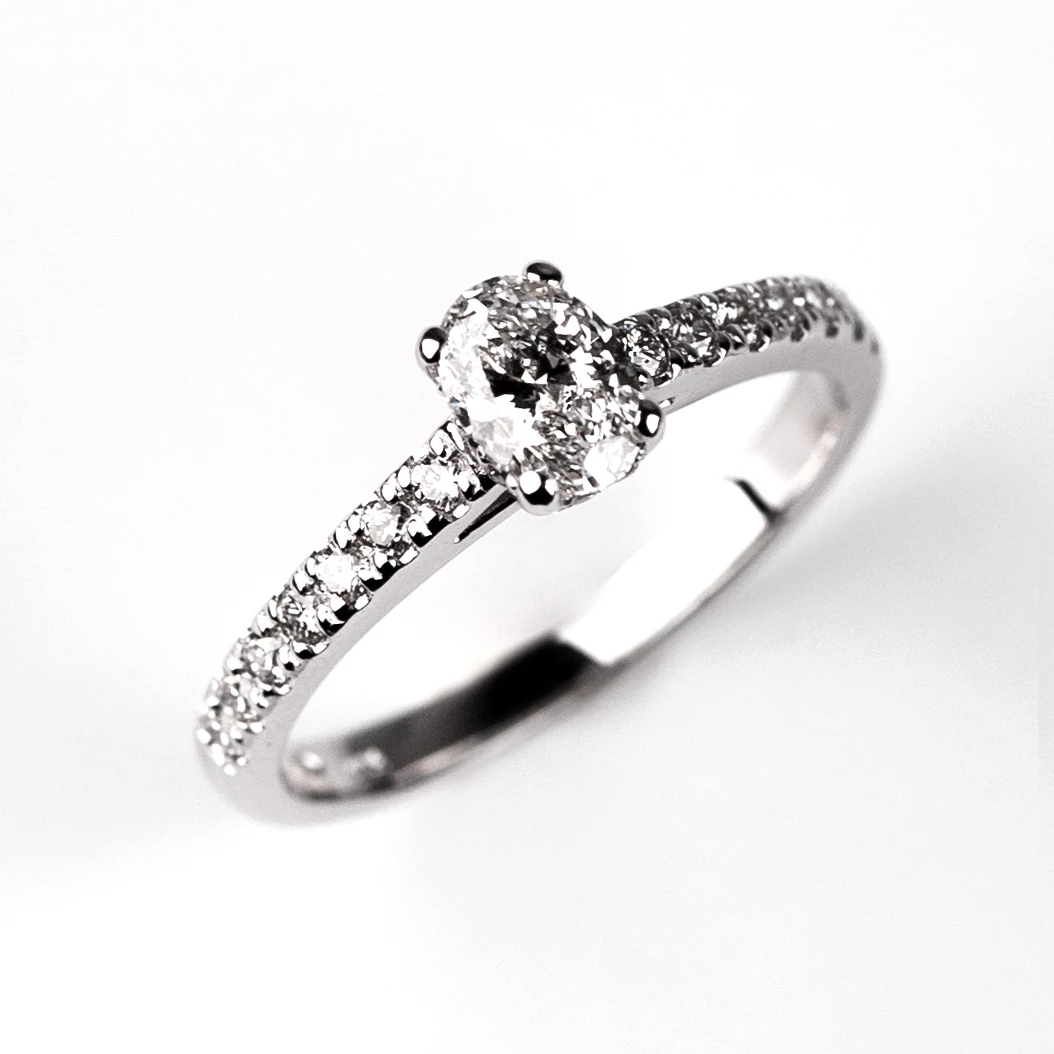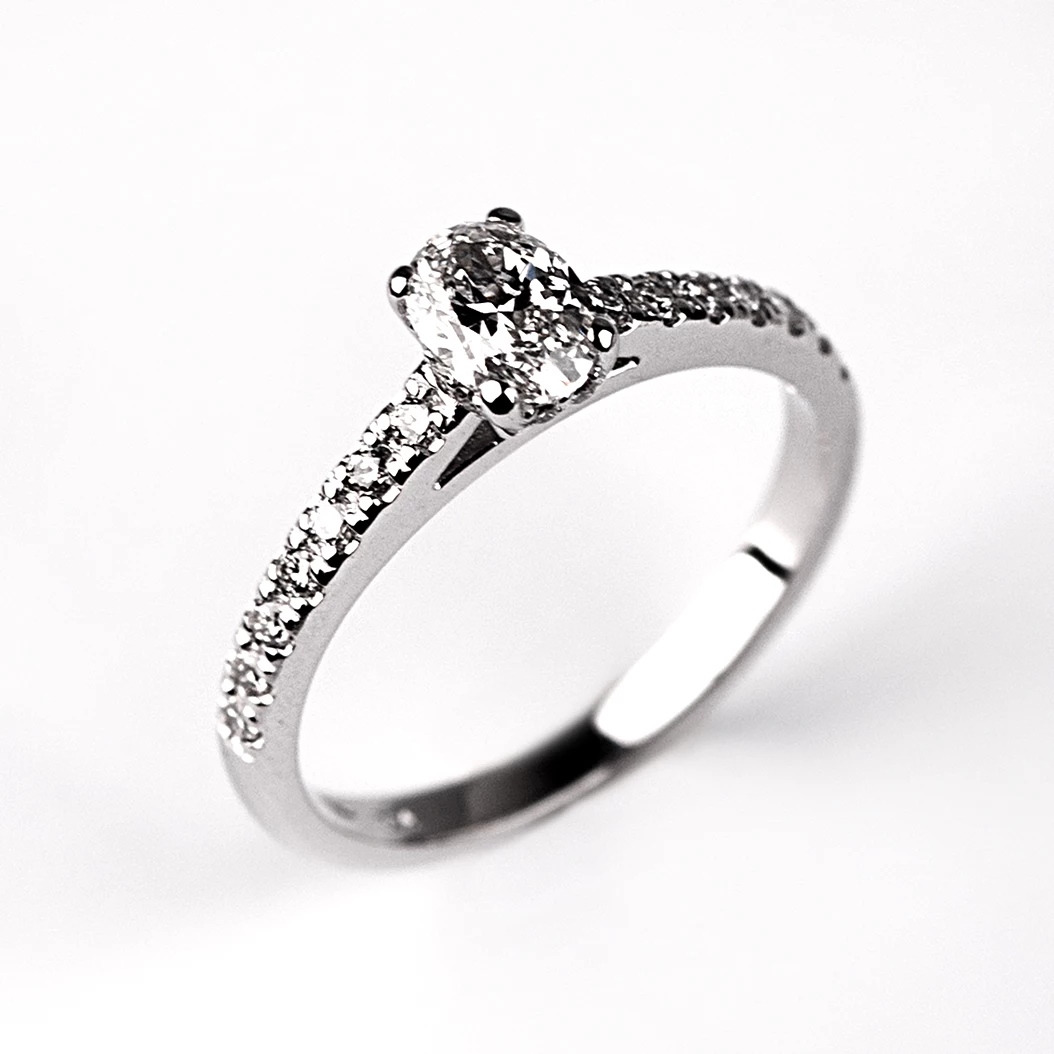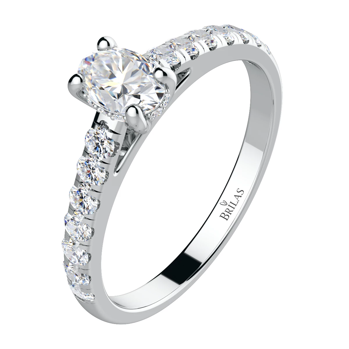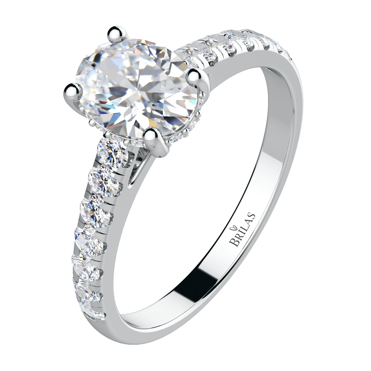 Zajímavý a originální zásnubní prsten z bílého zlata. Na tomto zásnubáčku naleznete dokonalý briliant o velikosti 8x6 mm či 6x4 mm. Dále je po bocích zdoben 14ti kameny o velikosti 1,6 mm. Jejich celková hmotnost je 0,710 ct. u kamene 6x4 mm a 1,25 ct. u kamene 8x6 mm. Vybrat si můžete přírodní brilianty (kvality SI1 a barvy G) nebo laboratorní (kvality VS a barvy F), jež jsou laboratorně vytvořené diamanty, jejichž optické, chemické a fyzikální vlastnosti jsou naprosto totožné s klasickými diamanty. Disponují tedy stejnou krásou jako vytěžené diamanty. Ideální volba pro partnerku, která oceňuje jednoduchost a kvalitní zpracování. Sbalit popis