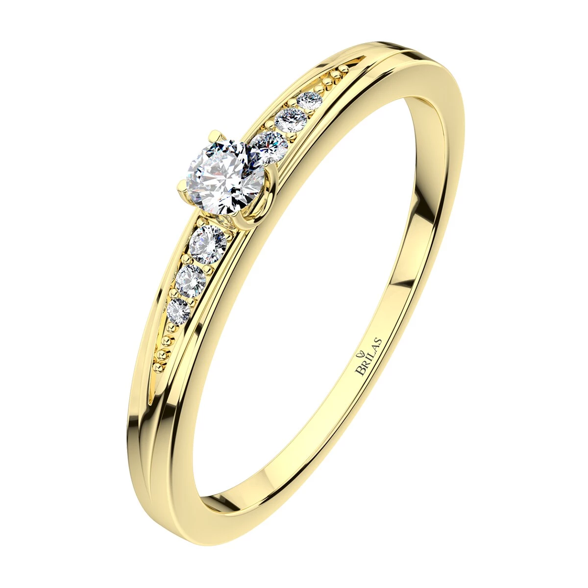 Projev lásky či poděkování za společné roky, to je zásnubní prsten Nomia. Jemný zásnubní prsten vyrobený ze žlutého zlata s dokonale propracovanými detaily.Prstenu vévodí jeden kámen o velikosti 3 mm. Od něj pak vedou na obě strany dvě trojice kamenů od největšího po nejmenší a to s rozměry 1,2 mm, 1,1 mm, a nejmenšími jsou pak kameny o 1 mm. Zásnubáček ideálně vhodný pro drobnější prsty. Sbalit popis