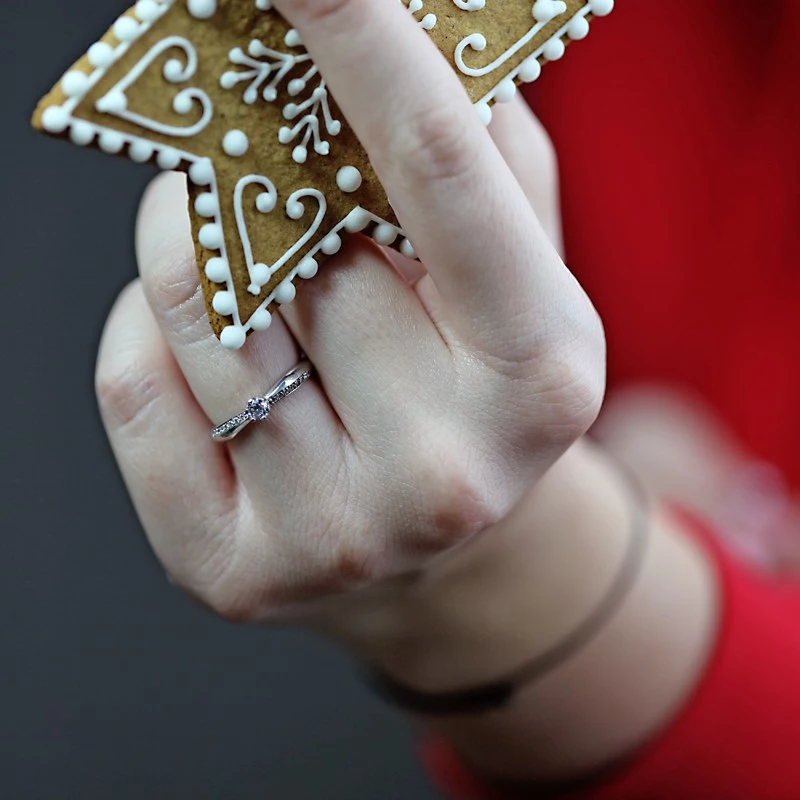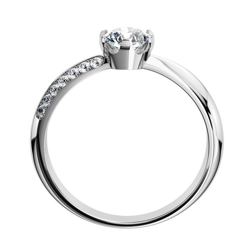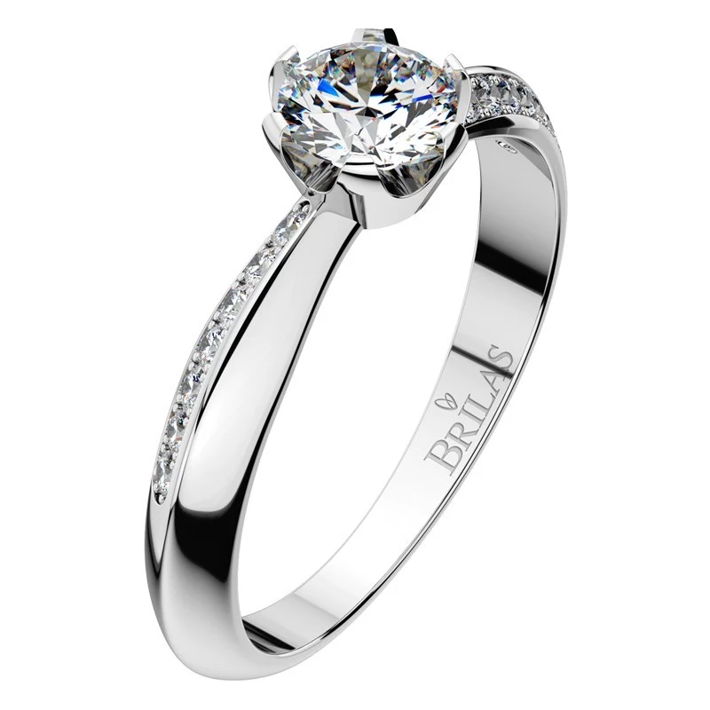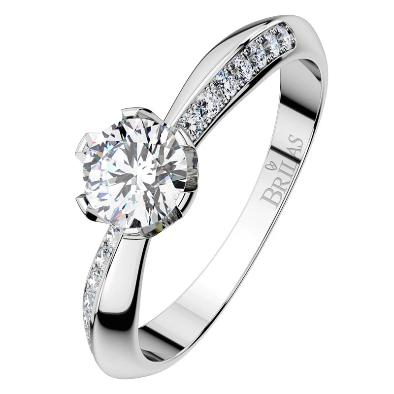 Z tohoto krásného zásnubního prstýnku číší lehkost a jemnost, který zahřeje u srdce každou dámu. Model je vyroben z bílého zlata. Na okrajích prstene jsou z jedné i druhé strany dvě řady drobných kamínků, které směřují k největšímu briliantu. Centrální kámen má 3,4 mm anebo 3,6 mm a celková hmotnost je 0,24 ct, 0,26 ct Sbalit popis