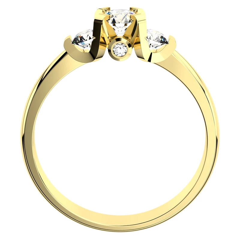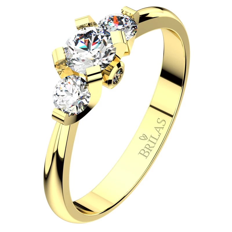 Tento prsten rozhodně nadchne každou ženu, která touží mít originální a netradiční zásnubní prsten a zdobit jím svou ruku po celý zbytek života. Zásnubní prsten Klára vyroben ze žlutého zlata zdobí 5 kamenů. Jeden o velikosti 4,25 mm a dva o velikosti 3,5 mm. Zbylé dva, které dodávají prstenu skvělý vzhled, mají velikost 1,5 mm a naleznete je z profilu prstene. Sbalit popis
