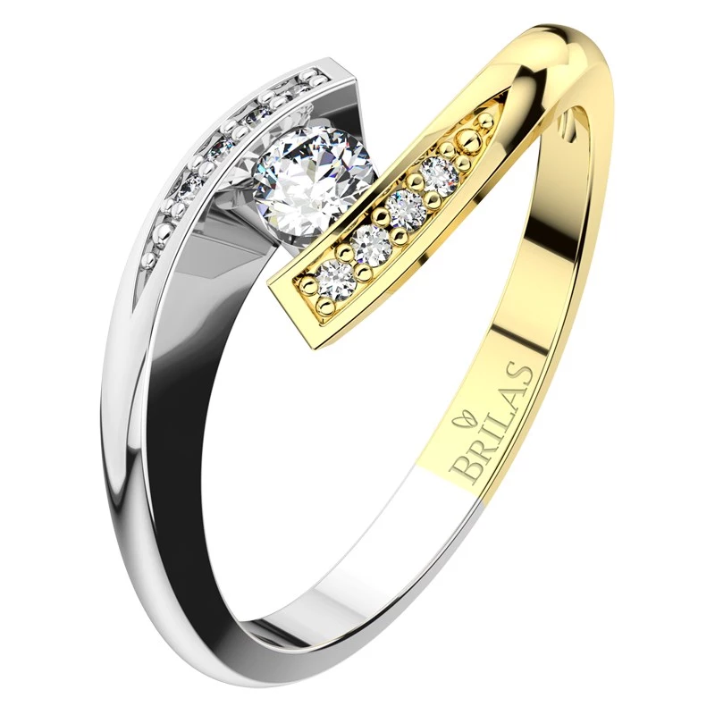 Jednoznačně nejoriginálnější zásnubní prsten z naší nabídky a zároveň jediný kousek, který nabízíme jak v bílé nebo žluté variantě, tak ve variantách kombinovaných. Zásnubní prsten Nuriana Colour GW Briliant není úplně typickým zásnubním prstenem, ale patří naopak mezi prsteny, který sluší opravdu každé dámě. Exkluzivitu a jedinečnost mu dodává centrální kámen o velikosti 3,25 mm, který je uchycen do dvou krapen. Každou krapnu navíc zdobí 4 brilianty velikosti 1,10 mm. Jejich celková hmotnost je 0,17 ct. Sbalit popis