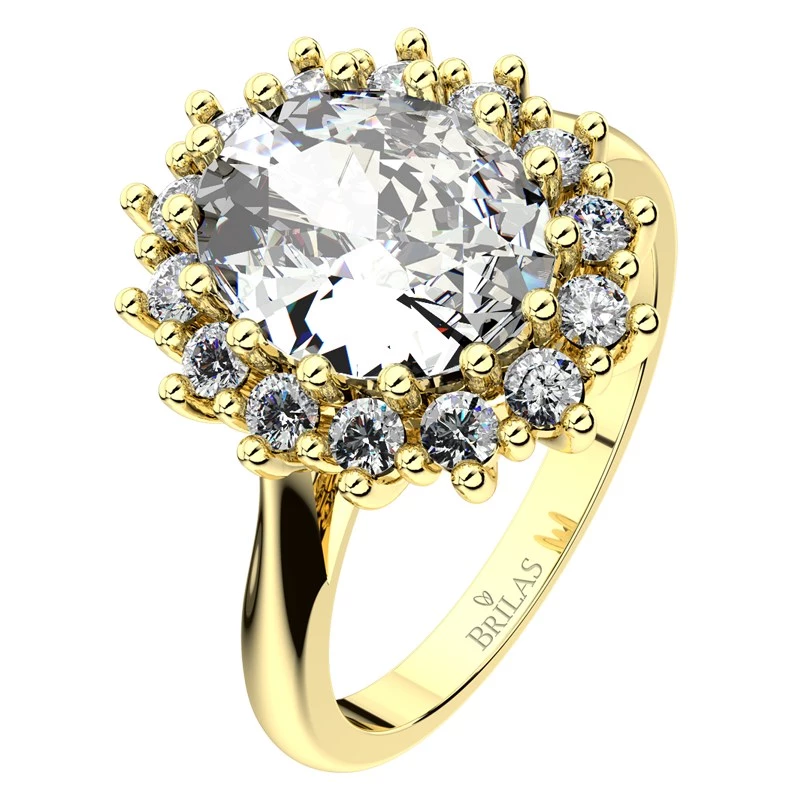 Exkluzivní zásnubní prsten vyroben ze žlutého zlata s centrálním kamenem dominujícím celému prstenu. Kámen je kulatého tvaru ve velikosti 10x8 mm a okolních 14 zirkonů je ve velikosti 2 mm. Pokud má Vaše přítelkyně ráda extravaganci anebo ji chcete věnovat něco opravdu výjimečného, tak neváhejte. Sbalit popis